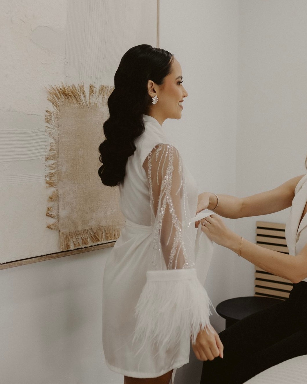 The Aurora Kimono is a short bridal robe designed for unforgettable “getting ready” moments. Crafted from our signature soft satin fabric. The transparent sleeves with beads, sequins, and sparkles catch the light beautifully. Sleeves finish with double rows of soft ostrich feathers, creating a refined and glamorous look.