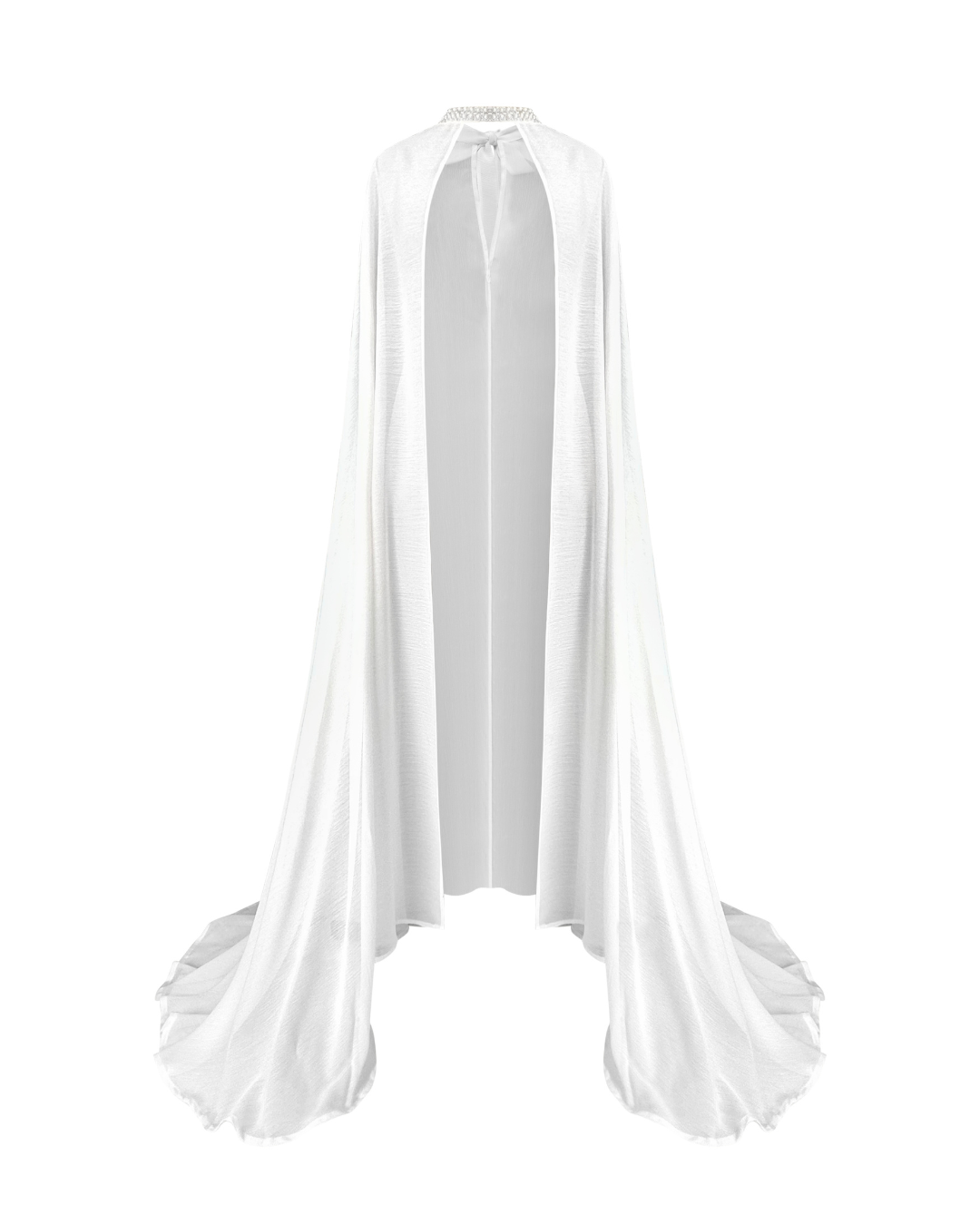 The Celeste Cape is a lightweight chiffon bridal cape with an elegant long train. Its neckline is delicately hand-trimmed with pearl beads and ties at the back of the neck with fine strings. Designed to complement a slip-on dress, it adds an ethereal touch to any bridal look.